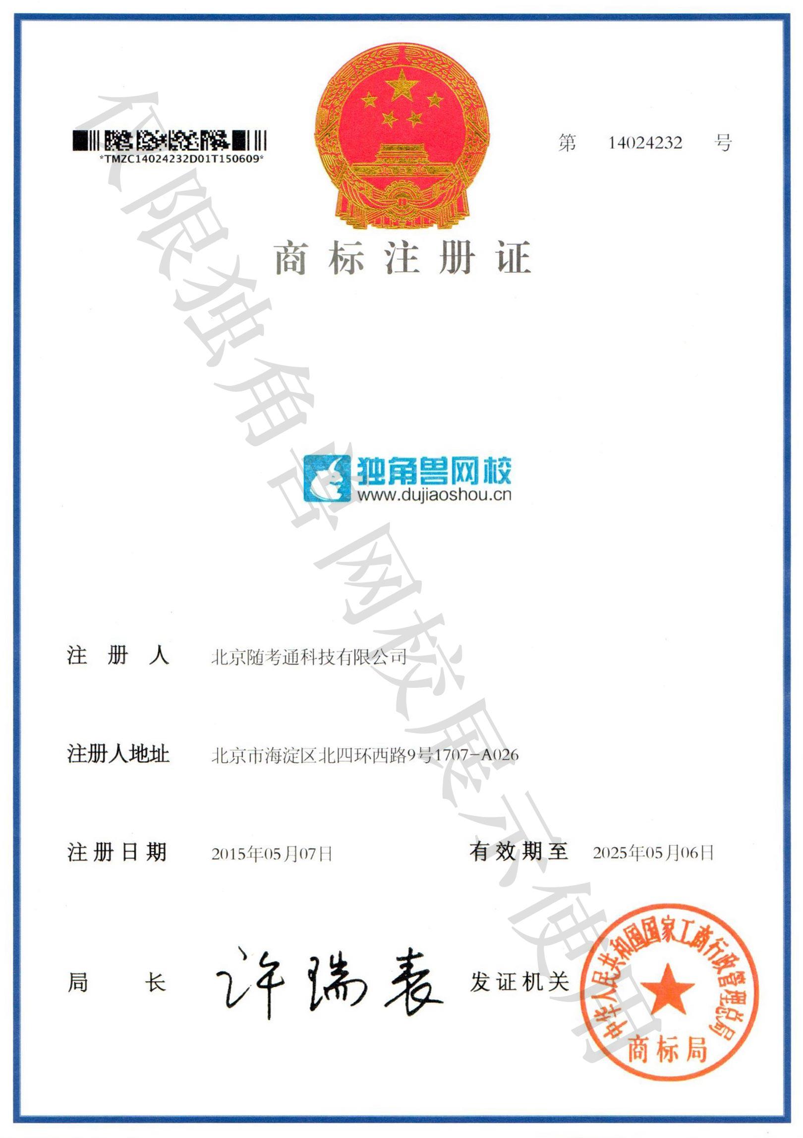 独角兽网校专注于司法考试培训,聘请一线名师授课,以优惠的价格、优质的教学服务、极高的通过率,赢得广大司法考试考生一致好评!2015年司法考试将很快来临,“独角兽网校”商标证书到来,希望为独角兽网校学员带来好运,帮大家顺利通过司法考试!同学们,也要加油啊!